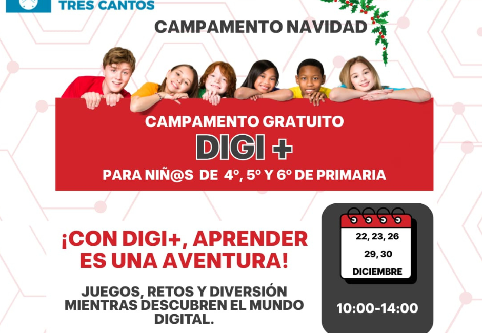 Estas vacaciones de Navidad el Ayuntamiento de Tres Cantos, en colaboración con CREA-RED, os presenta DIGI+, un campamento dentro del Programa de Competencias Digitales para la Infancia (CODI), dirigido a niños y niñas de 4.º a 6.º de Primaria. A través de actividades, desafíos y retos, los participantes aprenderán a explorar la web, crear contenido atractivo, identificar y combatir las noticias falsas y desenvolverse por internet de manera segura.